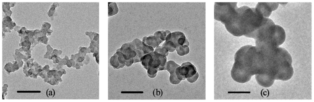 TEM images of NCBs. (a) Printex 90; (b) Printex G; and (c) Flammruss 101. The scale bars correspond to 100 nm.