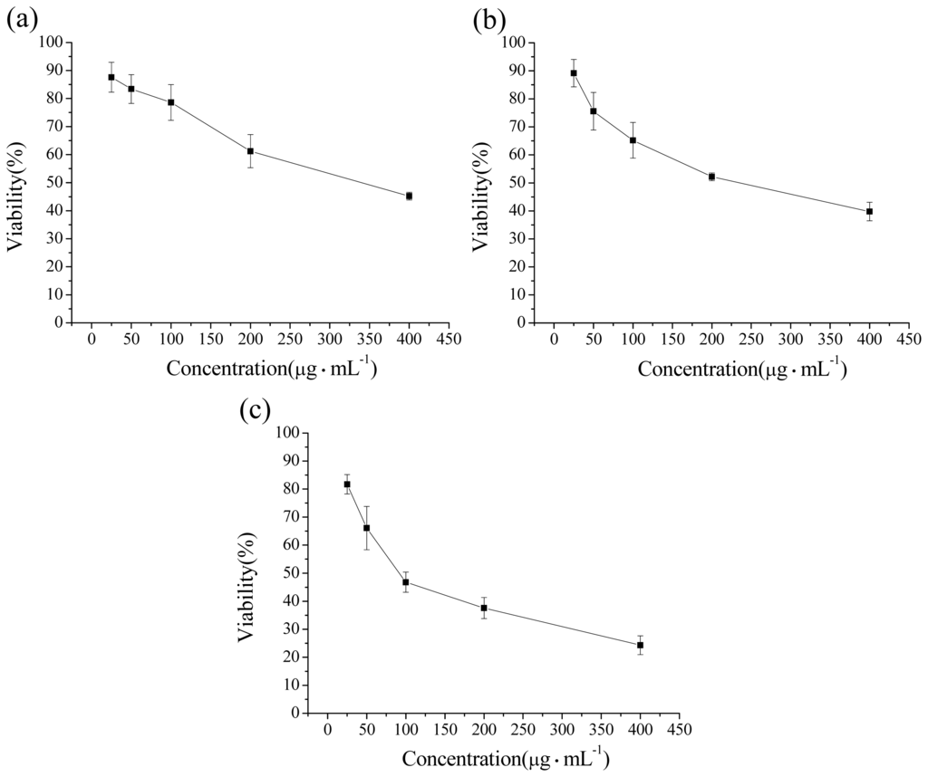 A cell suspension (105 cells/well) was dispensed into 24-well plates and incubated overnight to allow for cell adherence. After washing twice with phosphate buffered saline (PBS), cells were treated with different sized NCBs at various concentration (25, 50, 100, 200 and 400 μg·mL−1). Cells without NCBs were used as controls. After 2, 24, and 48 h incubation, the cell viability was determined by the [3-(4,5-dimethylthiazol-2-yl)-2,5-diphenyltetrazolium bromide] MTT assay (Sigma-Aldrich, Shanghai, China) and expressed as a percentage of ODtreat/ODcontrol. All viability determination data were based on three independent experiments.