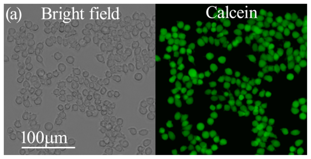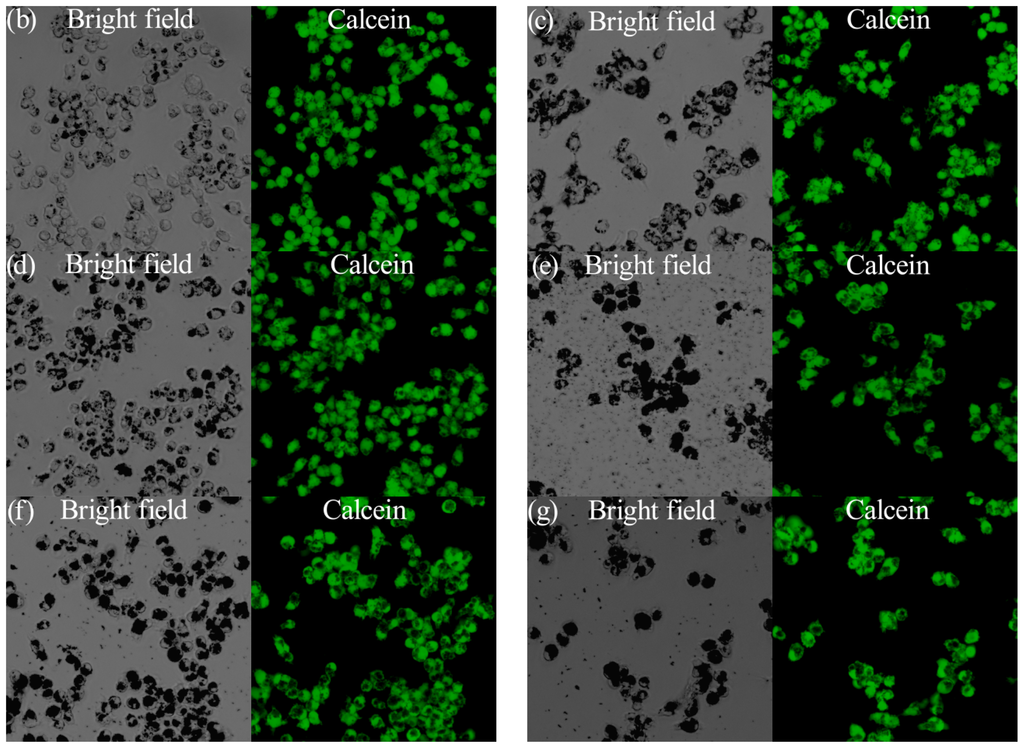 Fluorescence-based LIVE assay was used to distinguish the live cells. Cells for imaging were seeded on 24-well culture plates at a density of 5 × 104 cells/well and incubated overnight to allow for cell adherence. After exposure to different sized NCBs at concentration of 50 and 200 μg·mL−1 for 24 h, the cells were washed thrice with PBS and stained with calcein AM (Invitrogen, Carlsbad, CA, USA, 2 μM, 10 min, Ex/Em: 494 nm/517 nm). Excess calcein-AM was washed with PBS and all samples were observed with the corresponding filters under a Leica DMI3000 B fluorescent microscope (Leica, Solms, Germany).