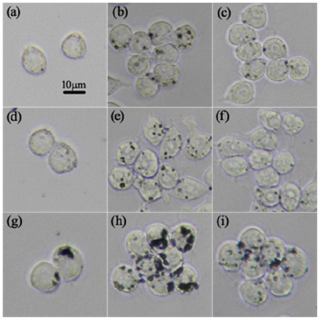Uptake of NCBs in RAW264.7 cells was then analyzed by optical microscopy. After exposed to 14 and 51 nm NCBs for 2 h, images showed that there were small aggregates with light color inside cells (Figure 4a,b), while after treatment with 95 nm NCBs for 2 h, there were dark aggregates inside cells (Figure 4c), indicating the cellular uptake amount of 95 nm NCBs was far more than that of the other two NCBs. After 24 h incubation, the black aggregates inside the cells increased significantly (Figure 4d–f), showing obvious cell uptake of NCBs over time. However, after 48 h incubation, we clearly observed a notable decrease in intracellular black aggregates (Figure 4g–i), suggesting exclusion of intracellular NCBs by exocytosis []. In addition, after 24 and 48 h incubation, the cell uptake amount of 95 nm NCBs was also much higher than that of the other two NCBs (Figure 4).
