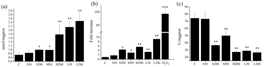 NCBs-induced oxidative stress in RAW264.7 cells. (a) MDA level; (b) ROS level; (c) SOD level. C: control; S50: 50 μg·mL−1 Printex 90; S200: 200 μg·mL−1 Printex 90; M50: 50 μg·mL−1 Printex G; M200: 200 μg·mL−1 Printex G; L50: 50 μg·mL−1 Flammruss 101; L200: 200 μg·mL−1 Flammruss 101. * p < 0.05; ** p < 0.01; *** p < 0.001; one-way ANOVA for comparison.