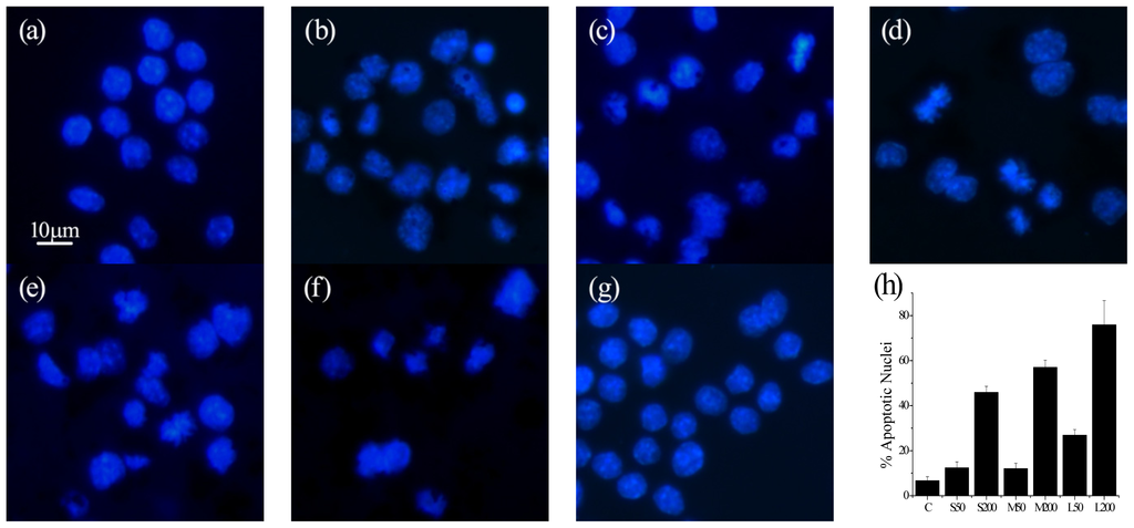 Cells for imaging were grown on 24-well plates with cover slips. After exposure to different sized NCBs at concentration of 50 μg·mL−1 and 200 μg·mL−1 for 24 h, the cells were washed thrice with PBS and then fixed with 4% paraformaldehyde-4% sucrose for 30 min. Following a further wash with PBS, cell nuclei were stained with DNA-specific fluorescent Hoechst 33258 (Sigma, Shanghai, China, 5 μg·mL−1, 10 min, Ex/Em: 352 nm/461 nm). All samples were observed under a Zeiss Axioskop2 plus fluorescent microscope (Carl Zeiss, Gottingen, Germany). A total of 100 cells per sample were analyzed and the percentage of the percent of apoptotic nucleic after treatment with different sized NCBs at various concentrations was calculated.