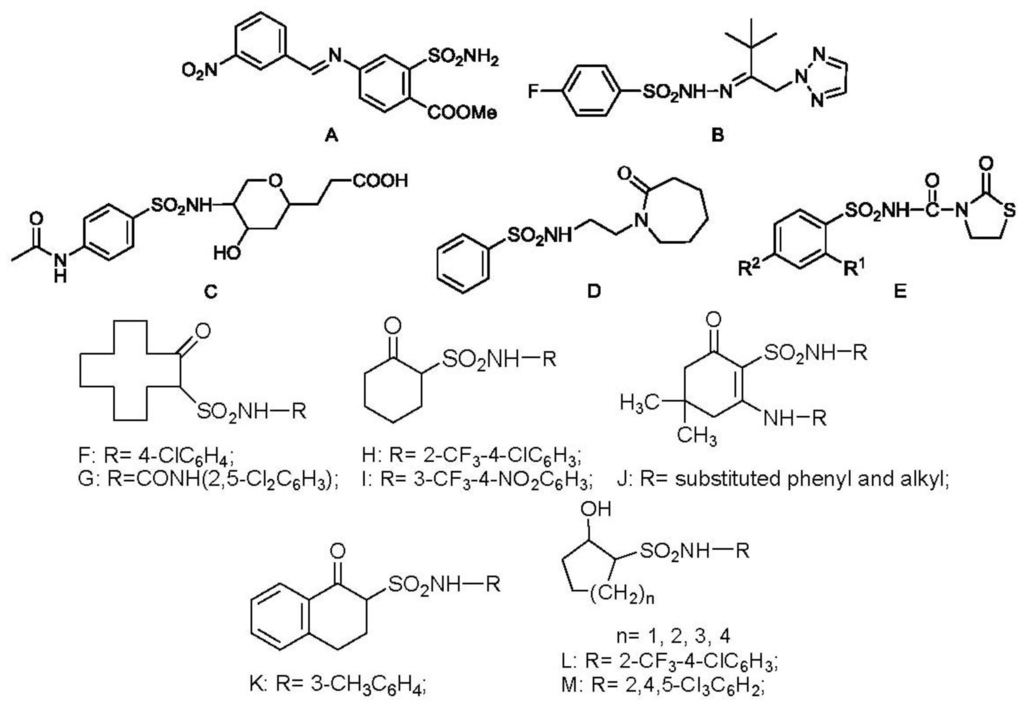 - Li, X.H.; Yang, X.L.; Liang, X.M.; Kai, Z.P.; Yuan, H.Z.; Wang, D.Q. Synthesis and biological activities of 2-oxocycloalkylsulfonamides. Bioorg. Med. Chem 2008, 16, 4538–4544. [Google Scholar]