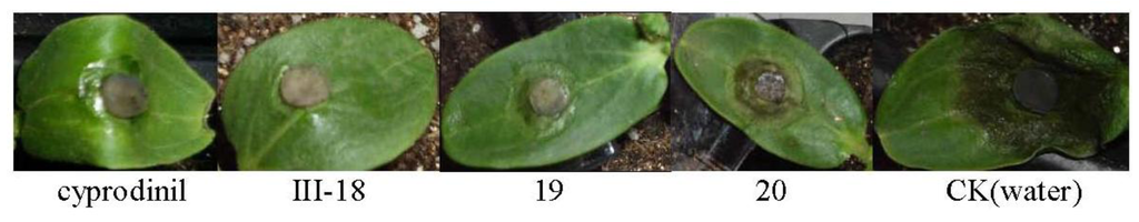 2.2.3. In Vivo Fungicidal Activity of Compounds III-18, 19 and 20 against B. cinerea