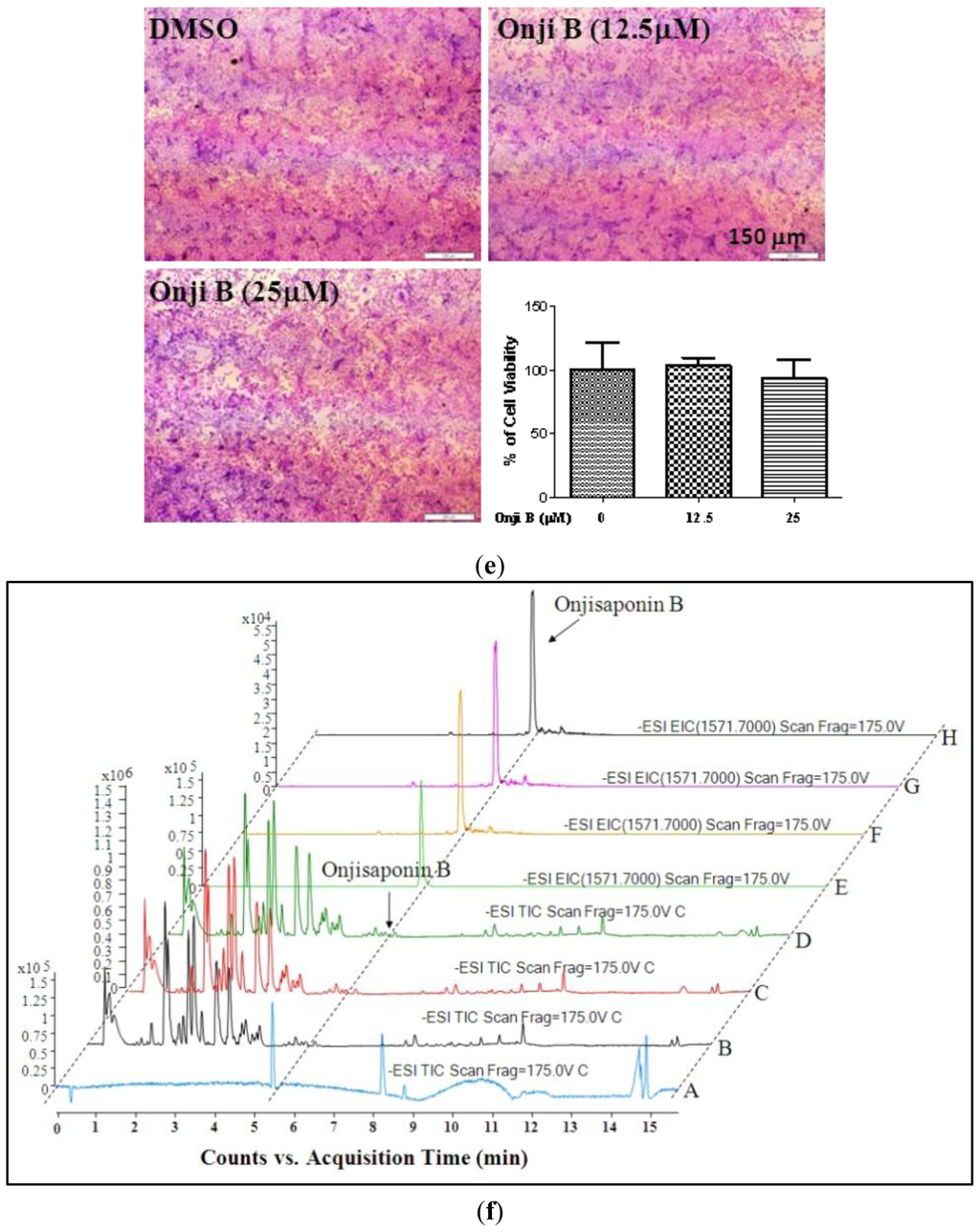 Further analysis of the ethanol extracts of Radix Polygalae using UHPLC-MS/TOF was performed in the scan mode from m/z 100–1700 Da with 2.0 spectra/s. In the range of the accurate mass from 100–1700 Da, it was found that 90 out of 91 compounds presented in the ethanol extracts of Radix Polygalae, matched with the compounds found in its herbal plant Polygalae Tenuifolia (Figure 4f) according to the Dictionary of Natural Products []. Furthermore, we confirmed that the concentration of onjisaponin B presented in the ethanol extract of Radix Polygalae was 4.28 μM as revealed by the standard curve deduction (data not shown). Taken together, these data indicated that onjisaponin B is probably the most active component responsible for the autophagy effect of Radix Polygalae extract. Besides, with no obvious cytotoxicity observed after treatments, onjisaponin B may work as a potential therapeutic agent for modulating neurodegenerative disorders in the future.