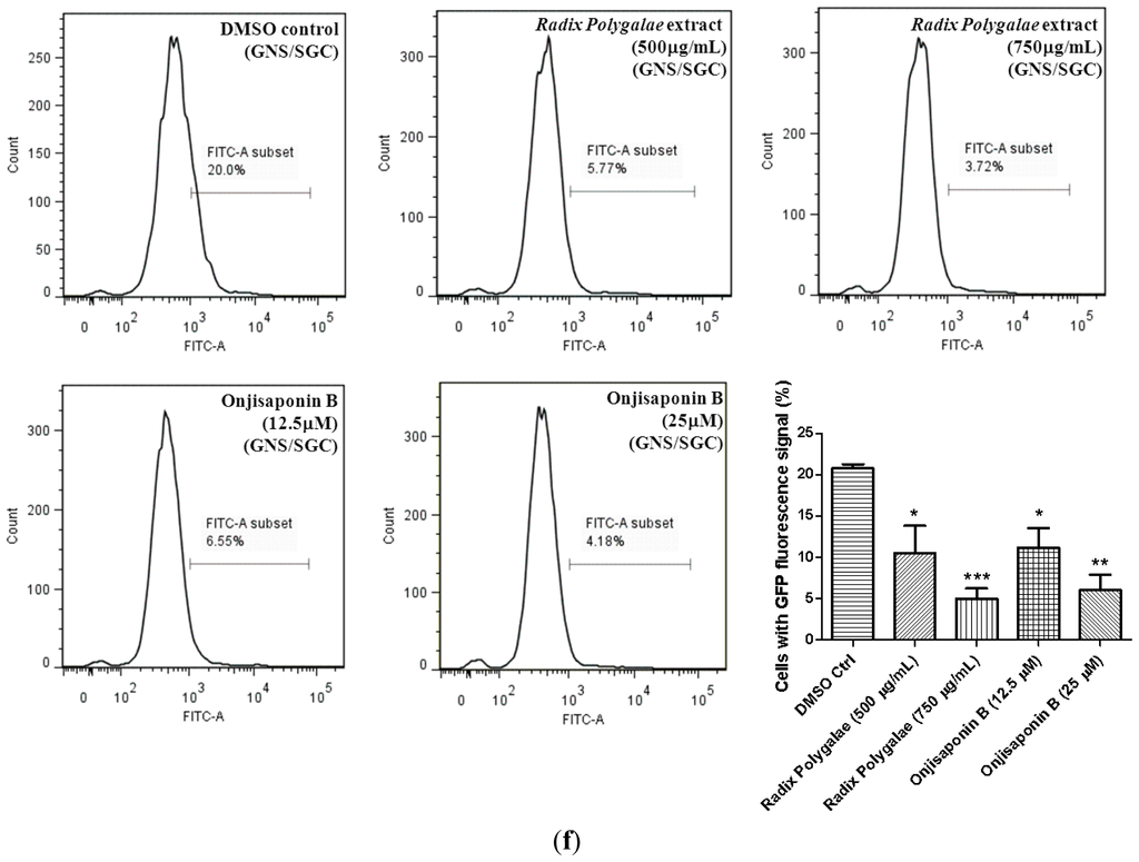 Other than the mutations in α-synuclein [,], misfolding, fibrillization or oligomerization of α-synuclein also play an important role in the pathogenesis of Parkinson’s disease (PD) [,]. Here, by using the bimolecular fluorescence complementation (BiFC) assay, we are able to directly quantify the oligomerization of α-synuclein in living cells []. In brief, α-synuclein proteins fused with two different non-fluorescent GFP terminal fragments, (i) GFP-N terminal-α-synuclein (GNS) or (ii) α-synuclein-GFP-C terminal (SGC), respectively, were used [,]. Upon oligomerization of α-synuclein, the two non-fluorescent fractions of GFP will therefore reconstitute the complete GFP fluorophore and give out GFP fluorescent signal within cells. This signal in turn can be quantified by flow cytometry analysis. As measured by flow analysis in Figure 6f, both Radix Polygalae crude extract and onjisaponin B inhibit the oligomerization of α-synuclein in HeLa cells transfected with GNS and SGC. HeLa cells were selected for the BiFC study due to their high transfection efficiency [,]. The decrease of GFP fluorescent signal suggested that both Radix Polygalae ethanol extract and its active component onjisaponin B may play a protective role in Parkinson’s disease through inhibiting α-synuclein oligomerization, which is a crucial step for α-synuclein aggregation. Taken together, these novel findings provide evidence to further support the neuroprotective function of Radix Polygalae ethanol extract and onjisaponin B in cellular model.