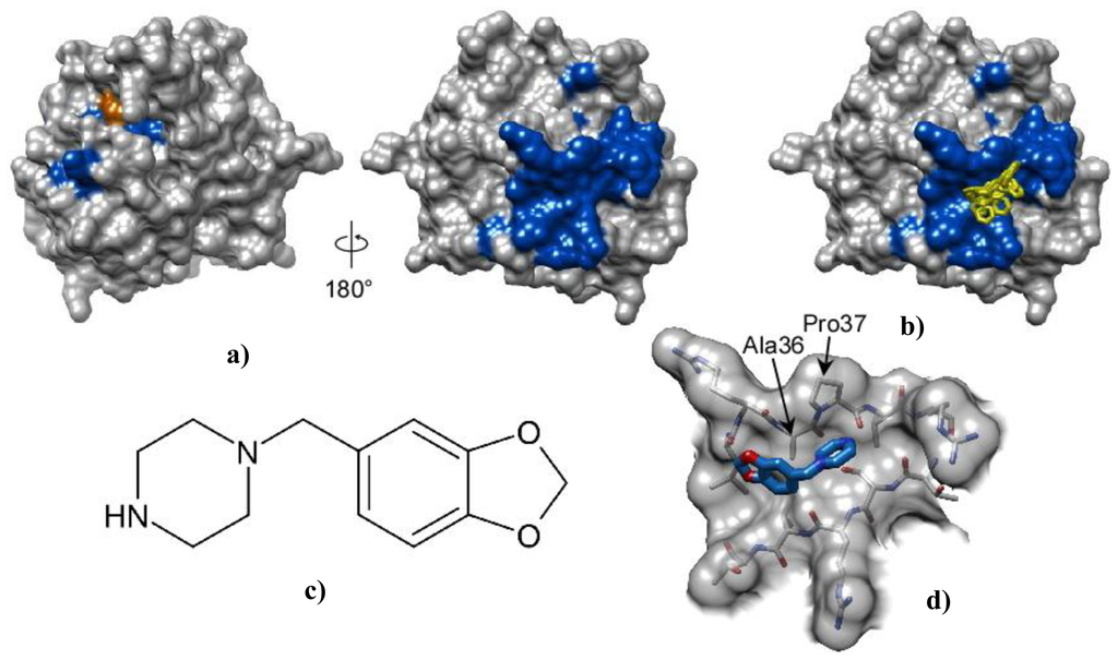 Interaction and docking of E. coli Pth1 with piperonylpiperazine. (a) Surface representation of E. coli Pth1 (PDBID:2PTH) shown with catalytically important His20 in orange. From NMR data, residues with 1H–15N resonances affected by interaction with piperonylpiperazine are in blue; (b) Docking: The six lowest energy orientations of piperonylpiperazine are shown in yellow; (c) Structure of piperonylpiperazine; (d) An enlarged view of the piperonylpiperazine binding site.