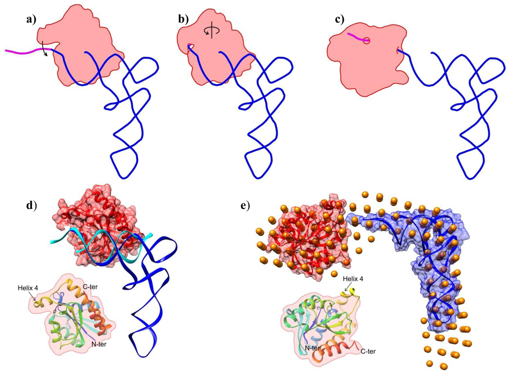 Model of Pth1 Interaction with peptidyl-tRNA. (a–c) Cartoon representation of the Pth1 (red) interaction model with peptidyl-tRNA (blue and magenta). (a) After substrate recognition; (b) helix 4 clamps the peptide portion (magenta) and CCA terminus of the substrate in the binding channel; (c) followed by the enzymatic reaction and release of products or just release of the nucleotide as observed in the SANS model; (d–e) Available high and low resolution structures of Pth1 and peptidyl-tRNA on which the model of interaction was built; (d) Crystal structures of the complex between Pth1 (PDBID:2PTH, red surface) and the TΨC loop of tRNA (PDBID:3VJR, cyan) with tRNAPhe(PDBID:1EHZ, blue) superimposed; (e) SANS model (orange beads) of the interaction presented here with the same coloring as in (d); Insets show the orientation of Pth1. In black, His20 is the only side chain shown.