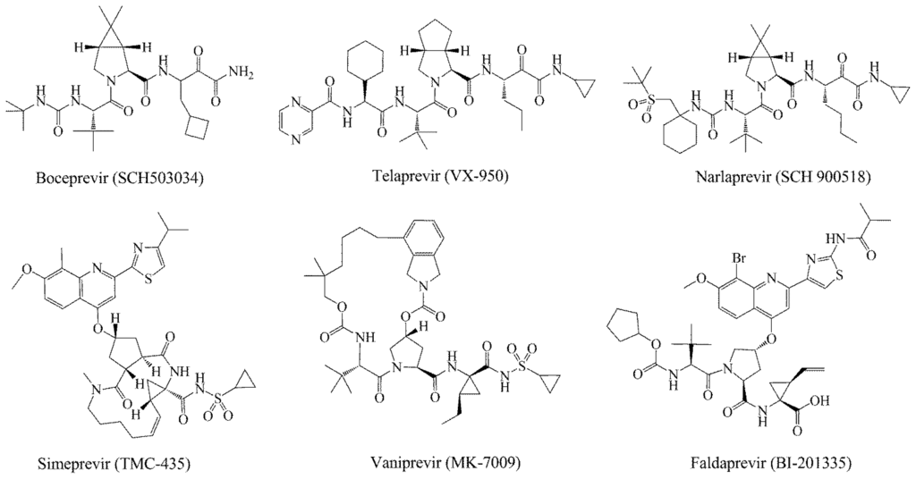 HCV non-structure (NS) proteins, NS3/NS4A serine protease, have been intensively studied as an attractive drug target for the development of DAAs [8]. The N-terminal domain of non-structural protein NS3 shows protease activity in complex with cofactor NS4A. The complex catalyzes the proteolytic cleavage of HCV polyprotein at four junctions between NS3, NS4A, NS4B, NS5A and NS5B and is hence responsible for the maturation of HCV polyprotein [9,10]. Nowadays, several inhibitors of NS3 protease have been reported in the literature, mainly explored for the optimization of natural substrates [2,11–15]. Additionally, some of the peptidomimetics endowed with high potential are being studied in clinical trials, of which the most advanced are listed in Figure 1. These inhibitors can be classified into two types depending on their mechanism of action: (1) reversible covalent inhibitors form a covalent bond with a residue of the catalytic triad (Ser139), such as linear α-ketoamide (SCH503034, VX-950 and SCH900518); and (2) non-covalent inhibitors depend on the C-terminal carboxylate (TMC-435, MK-7009 and BI201335), which is mostly a macrocyclic compound [16–21]. Among them, Telaprevir [22] and Boceprevir [23] have been approved by the FDA (U.S. Food and Drug Administration) as the therapy of chronic HCV genotype 1 in May, 2011.