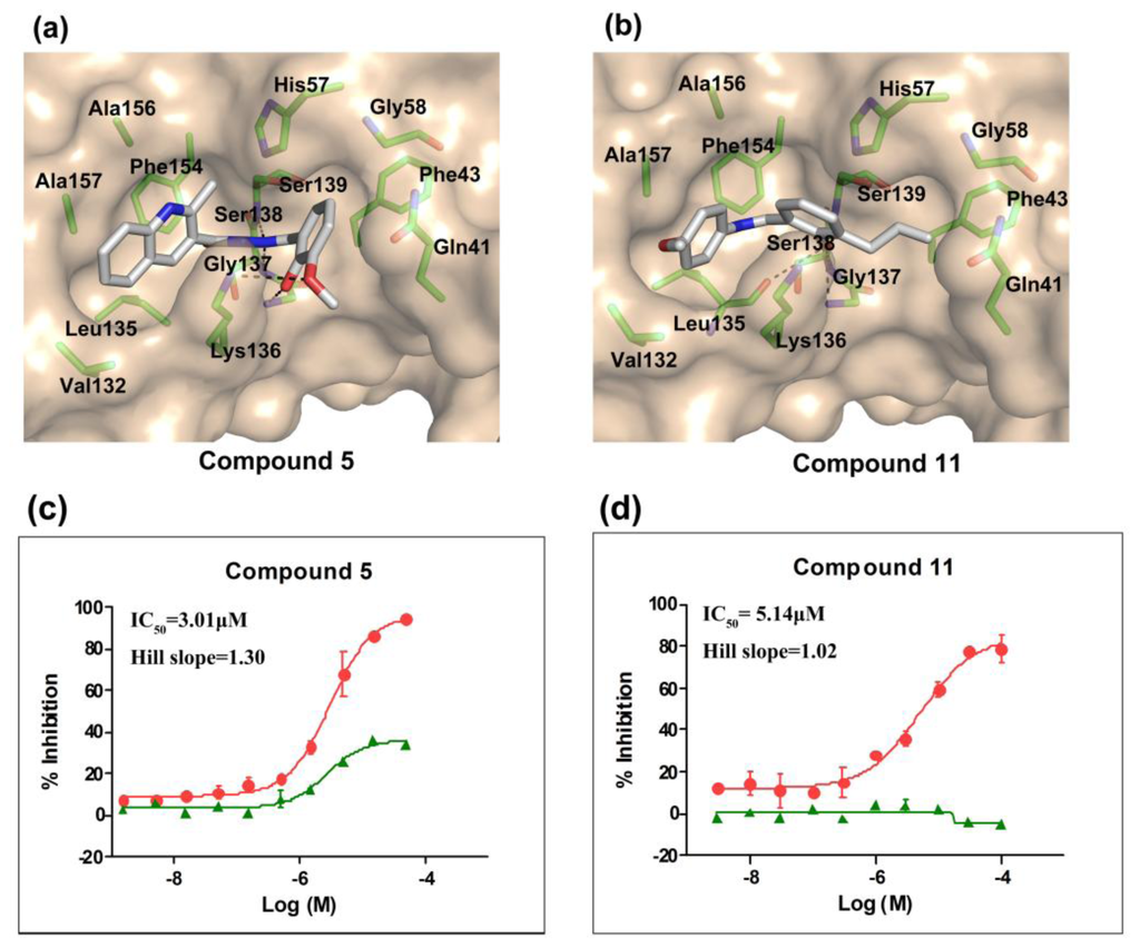 The binding models and dose-response curves of compound 5 (a,c) and compound 11 (b,d). (a) Glide-predicted binding pose for compound 5 within the active site of HCV NS3/NS4A serine protease (PDB ID: 3KEE); (b) glide-predicted binding pose for compound 11; (c) dose-response curve for compound 5 (circular dots) determined using HCV replicon system; (d) dose-response curve for compound 11 (circular dots) determined using HCV replicon system. Cyclosporine A (CSA) was used as a positive control (green triangles).