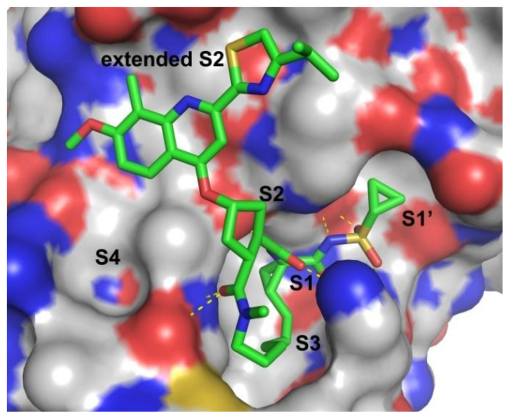 Crystal structure of HCV NS3/NS4A protease in complex with TMC-435 (PDB ID: 3KEE) [19]. Binding subsites of S1’-S4 in the active site are indicated on the surface representation and labeled in black. The bound inhibitor, TMC-435, is shown as a ball-and-stick model and is colored by atom type. For clarity, hydrogen atoms are omitted.