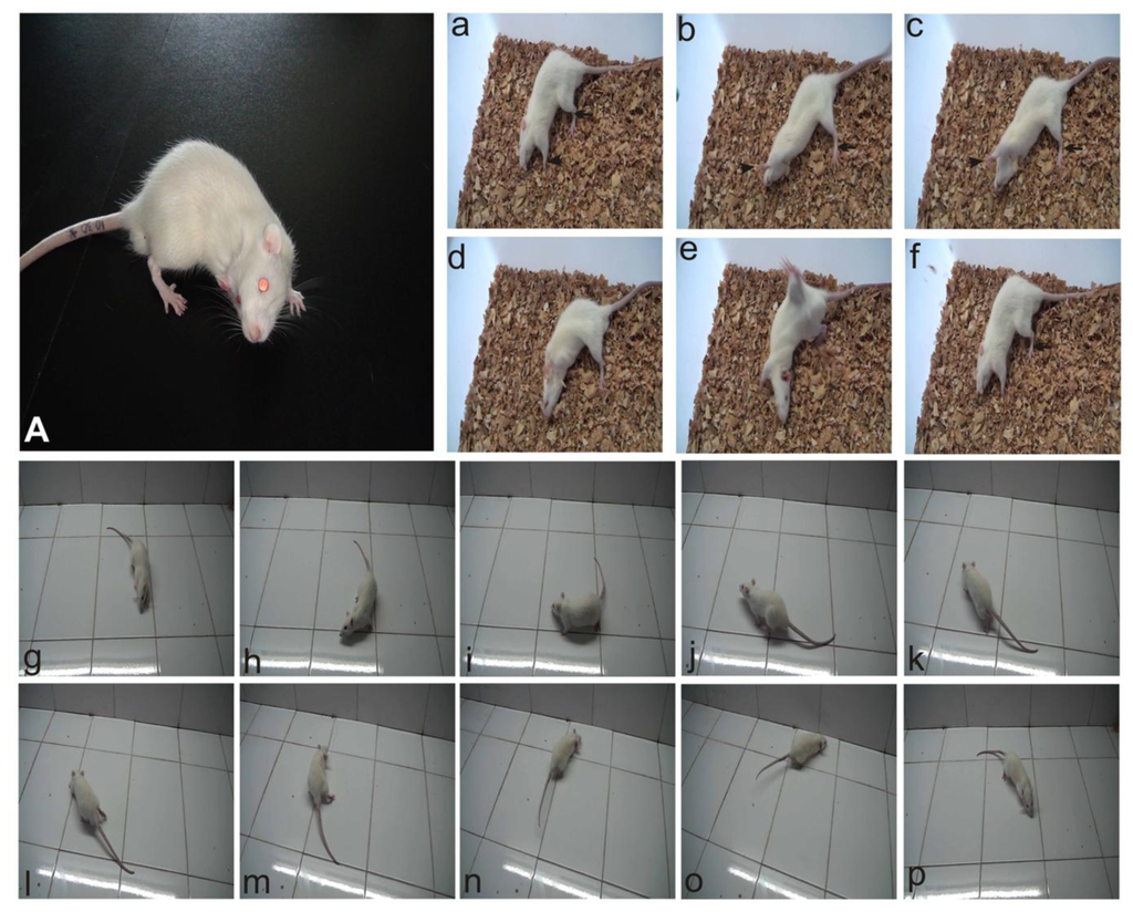 Behavioral aymmetries after unilateral labyrinthectomy on the right side. (A) Demonstrated the head tilting towards the operated side; (a–f) and (g–p) showed the rolling and circling movements, respectively. Note head rotation and the displacement of forelimb (arrowheads) and hind limb (arrows) on the intact side (left side in this case).