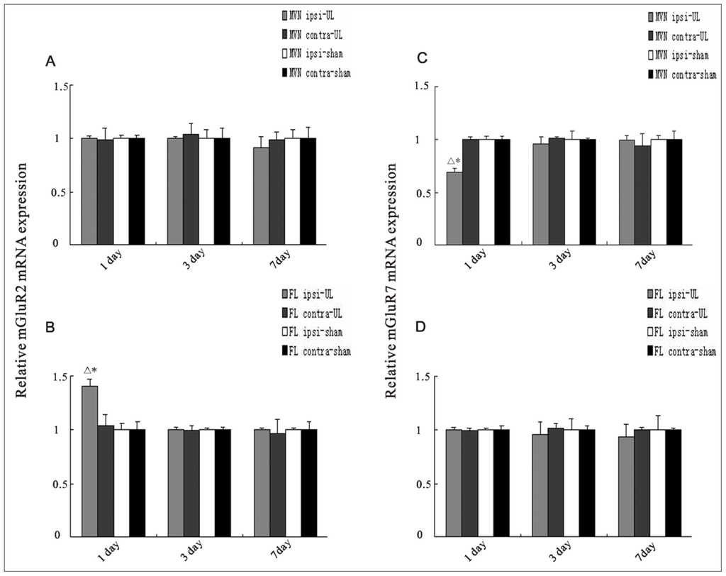 Quantitative analysis of the mRNA expression of mGluR2 (A,B) and mGluR7 (C,D) in the MVN and flocculus at the 1st, 3rd, and 7th day following UL or sham operation. The mRNA level of mGluR2 was significantly increased in the ipsilateral (ipsi) flocculus at the 1st day after UL compared to sham controls and contralateral (contra) side. The columns represent means ± SEM of six rats per group. * p < 0.01 vs. 1 day post sham; Δp < 0.05 vs. contra. The mRNA level of mGluR7 was significantly decreased in the ipsilateral (ipsi) MVN at the 1st day after UL compared to sham controls and contralateral (contra) side. Columns represent means ± SEM of six rats per group. * p < 0.05 vs. 1 day post sham; Δp < 0.01 vs. contra.