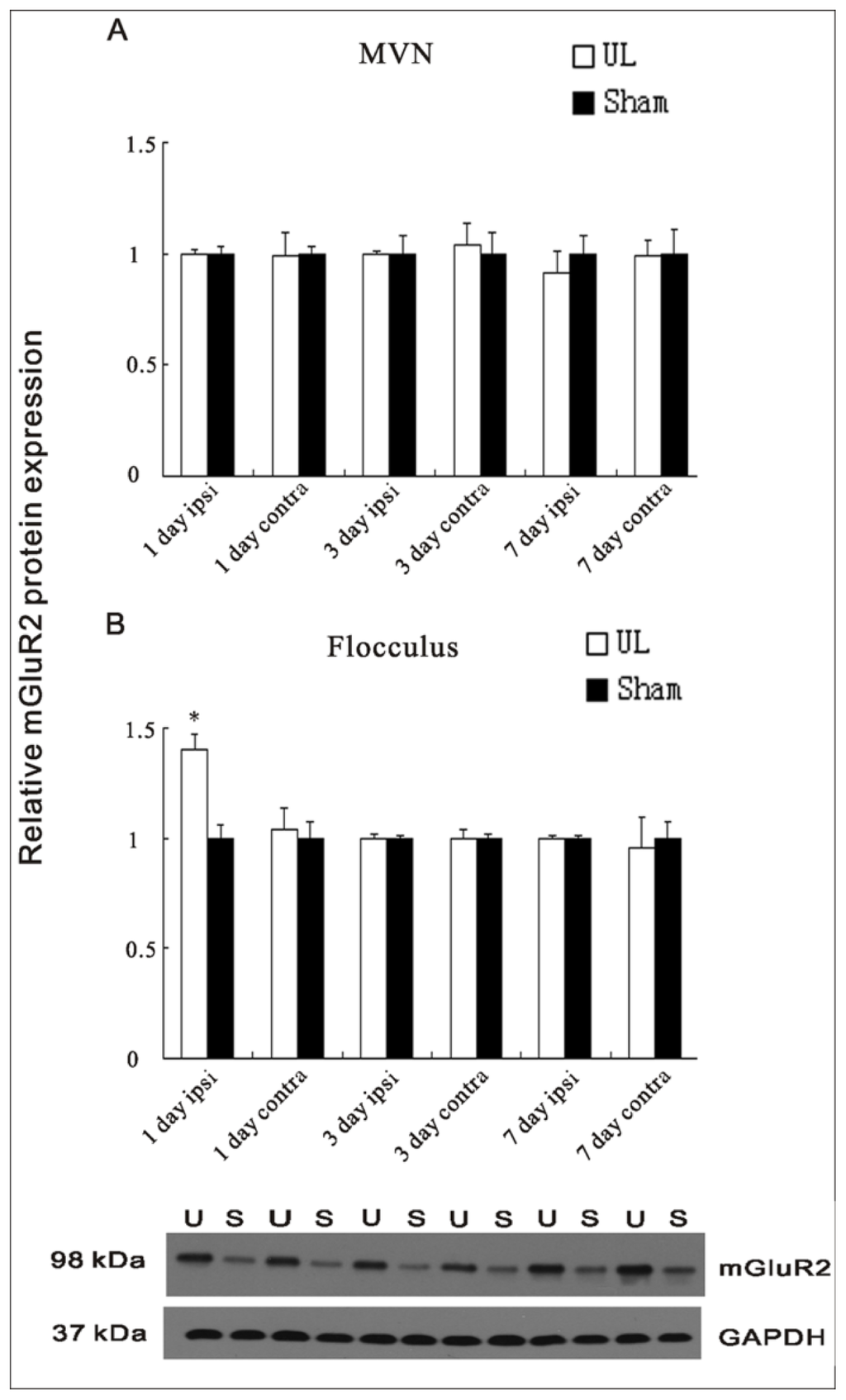 Quantification of the mGluR2 protein expression in the ipsilateral (ipsi) and contralateral (contra) MVNs (A) and flocculus (B) at the 1st, 3rd, and 7th day following UL compared to sham operation at the same time; (B) The protein level of mGluR2 was increased in the ipsilateral (ipsi) flocculus at the 1st day after UL compared to the ipsilateral (ipsi) sham controls. The columns represent means ± SEM of six rats per group. Inset shows a Western blot for mGluR2 in the ipsilateral flocculus at the 1st day following UL compared to sham controls at the 1st day postoperative. Ten micrograms of protein were applied in each lane (n = 6 for both UL and sham groups). U = UL, S = sham. * indicates a significant difference from ipsilateral sham controls (p < 0.01).