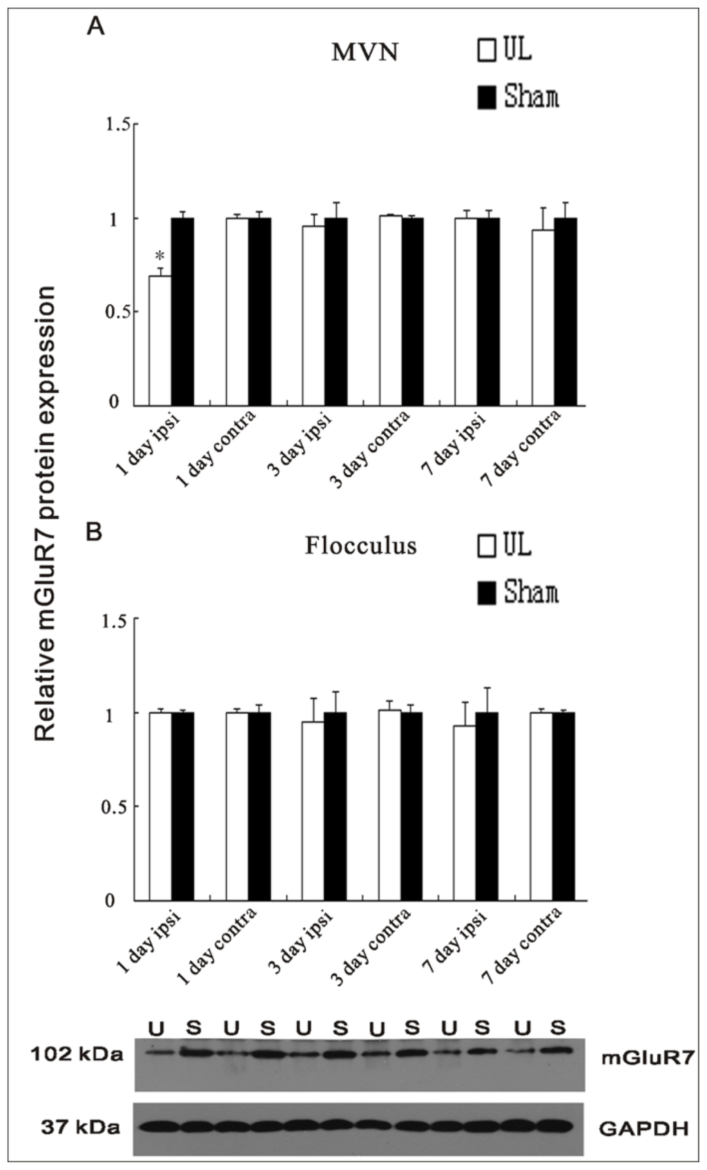 Quantification of the mGluR7 protein expression in the ipsilateral (ipsi) and contralateral (contra) MVNs (A) and flocculus (B) at the 1st, 3rd, and 7th day following UL compared to sham operation at the same time; (A) The protein level of mGluR7 was decreased in the ipsilateral MVN at the 1st day after UL compared to the ipsilateral sham controls. The columns represent means ± SEM of six rats per group. Inset shows a Western blot for mGluR7 in the ipsilateral MVN at the 1st day following UL compared to sham controls at the 1st day postoperative. Ten micrograms of protein were applied in each lane (n = 6 for both UL and sham groups). U = UL, S = sham. * indicates a significant difference from ipsilateral sham controls (p < 0.01).