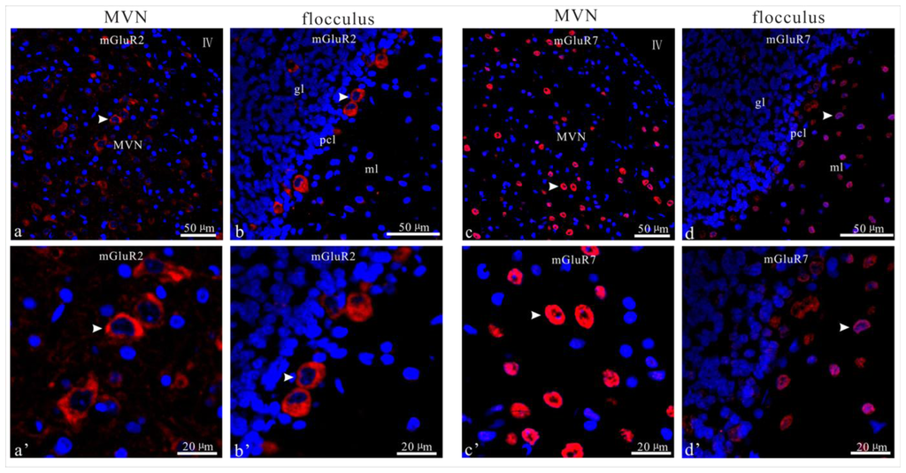 Illustration of mGluR2 and mGluR7 immunoreactive neurons in the MVN and flocculus of sham control rats. (a,b,a′,b′) showed the mGluR2 in the MVN and flocculus; (c,d,c′,d′) showed the mGluR7 immunolabled neurons in the MVN and flocculus; (a′–d′) are the enlarged cell images in (a–d). The same cells can be identified by the arrowheads.