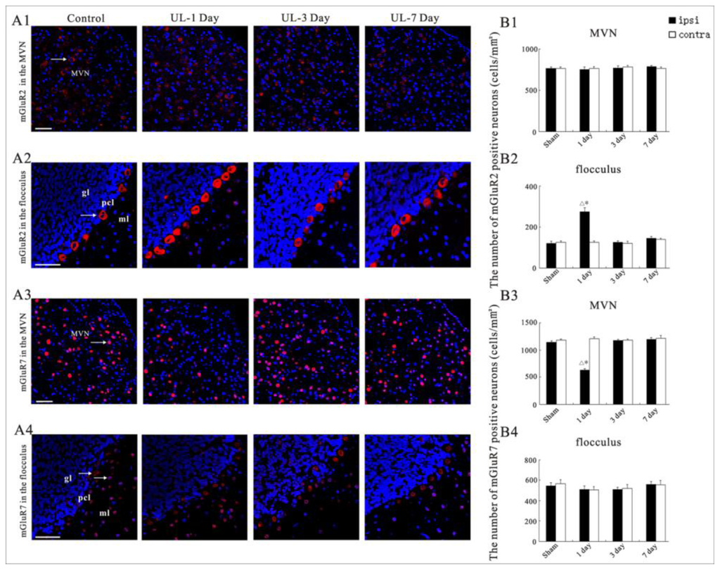 In the UL rats, at the 1st day after UL, the mGluR7 staining in the MVN decreased on the ipsilateral side compared to sham controls, but the mGluR7 staining on the contralateral side did not change compared to sham controls. At the 3rd day after UL, the mGluR7 staining on both sides of the MVN was similar to that of the sham controls. At the 7th day after UL, the mGluR7 staining on both sides of the MVN was similar to the postoperative day three (Figure 6A3,B3). However, in the MVN, there were no changes in the number of neurons expressing mGluR2 over time after UL (Figure 6A1,B1). At the 1st day after UL, in the flocculus the mGluR2 staining increased on the ipsilateral side compared to sham controls, whereas mGluR2 staining on the contralateral side did not change compared to sham controls. At the 3rd day after UL, the mGluR2 staining in both sides of the flocculus was similar to that of the sham controls. At the 7th day after UL, on both sides of the flocculus, the mGluR2 staining was similar to the postoperative day three (Figure 6A2,B2). However, in the flocculus, there were no changes in the number of neurons expressing mGluR7 over time after UL (Figure 6A4,B4).