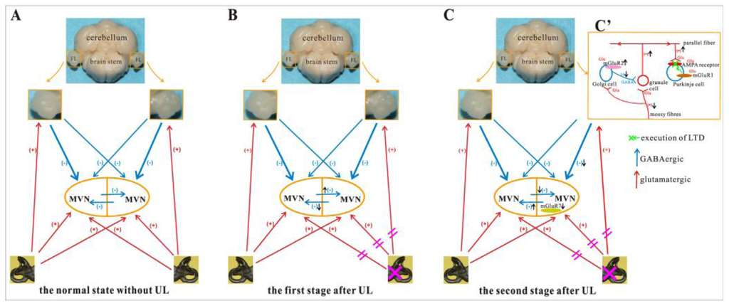 In conclusion, we investigated the changes of both the mRNA and the protein expression of mGluR2 and mGluR7 in the MVN and the flocculus at the 1st, the 3rd, and the 7th day following UL. Our results have demonstrated that mGluR7 was down-regulated in the ipsilateral MVN at the 1st day after UL; the mGluR2 was up-regulated in the ipsilateral flocculus at the 1st day after UL. Our results suggest that the changes of mGluR2 and mGluR7 expression might play a role in rebalancing of resting activity between the ipsilateral and contralateral MVNs (Figure 7). Furthermore, we would have to determine how to change for the mGluR1 in the flocculus during the process of vestibular compensation; which type of specific neurons with mGluR2 or mGluR7 expression contributes to the vestibular compensation and how do these neurons work in the vestibulocerebellar system.