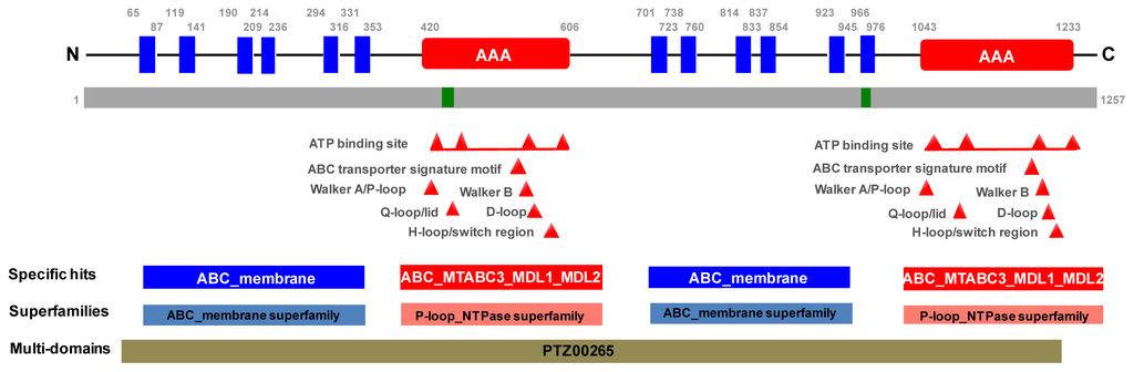 Figure 1. Schematic drawing of the primary and secondary structures of PxPgp1. TMpred and the conserved domain database from NCBI were used to construct this map. Signature motifs of the ABC superfamily are color-coded, including transmembrane domains (blue), a nucleotide domain (red) and regions with low complexity (green). PTZ00265 in grey denotes a multidrug-resistance protein (mdr1).