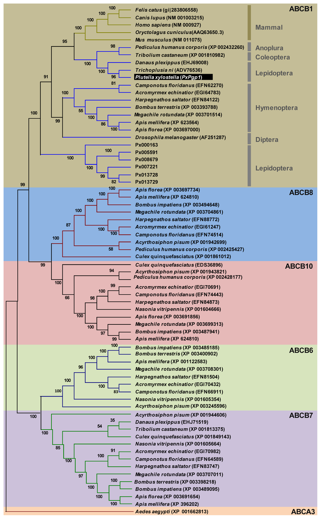 Phylogenetic analysis clustered PxPgp1 with ABCB1 genes from P. xylostella genome, other insect species and mammal Pgps from the ABCB subfamily, within the ABCB1 subgroup (Figure 2). Among them, PxPgp1 had the highest sequence similarity with two other lepidopteran species, the cabbage looper, T. ni (74%) and the monarch butterfly, D. plexippus (71%), which are substantially higher than its similarity with Pgps from other insect orders, including 10 hymenopteran insects (44%–48%), the human body louse, Pediculus humanus corporis (49%) and the red flour beetle, T. castaneum (51%).