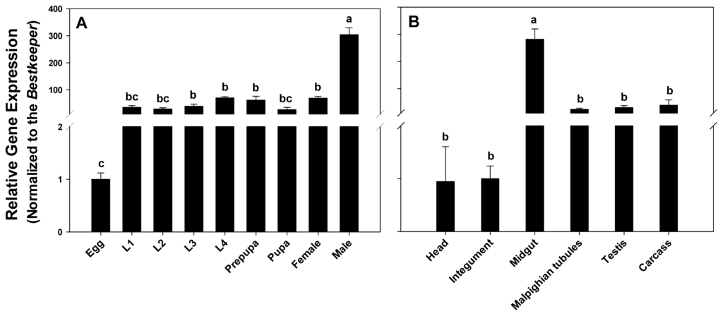 Figure 3. Expression profiles of PxPgp1 in different developmental stages and tissues. Distribution of PxPgp1 in different developmental stages of P. xylostella is depicted in (A). The mRNA quantity is expressed relative to the egg stage. L1 to L4 denote the first- to fourth-instar larvae, respectively. The relative expression levels of Pgp in various tissues of fourth-instar larvae are shown in (B). Data are presented as mean ± SE for three independent replicates. Letters denote levels of statistical significance, according to Tukey’s test (p < 0.05).