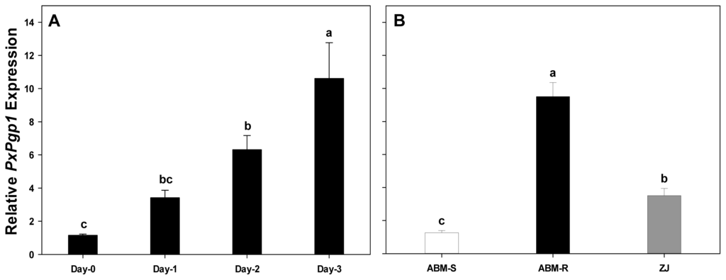 Figure 4. Transcriptional response of PxPgp1 to abamectin. Relative gene expressions of PxPgp1 after treatment with abamectin are shown in (A). The constitutive expressions of PxPgp1 in abamectin-resistant and -susceptible Plutella xylostella is shown in (B). ABM-R and ABM-S represent laboratory-selected abamectin resistant and susceptible P. xylostella strains, respectively, and ZJ is field strain collected from Zhejiang Province, China. Data are presented as means ± SE. Letters denote levels of statistical significance in expression levels according to Tukey’s test (p < 0.05).