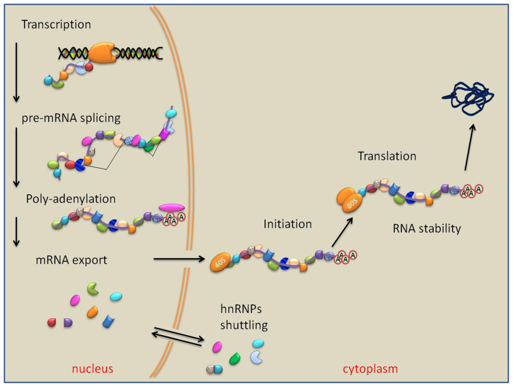 RNA binding proteins are involved in all steps of RNA biogenesis. Starting from pre-mRNA transcript synthesis, a variety of different RNA binding proteins are associated within the heterogeneous ribonucleoprotein complexes, participating in the processes which result in the formation of mature mRNA, including pre-mRNA splicing and addition of 3′ poly(A) tails in the nucleus and mRNA export through the nuclear pores. In the cytoplasm, they participate in localization, initiation of translation, and mRNA stability.