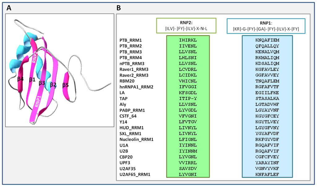 The members of the hnRNP protein family were initially discovered in the late 1980s and were attributed to the same protein family by the presence of the RRM, which is the most conserved domain among the RNA binding domains (RBDs). The RRM is a functional domain broadly distributed in hundreds of proteins encoded by eukaryotic genomes. Compared to other known RBDs, such as the K-homology domain, the RGG (Arg-Gly-Gly) box, the Sm domain, the DEAD/DEAH box, the Pumilio/FBF (PUF domain) and the Piwi/Argonaute/Zwille (PAZ), for review see [27], RRM is structurally quite different. RRMs containing genes represent about 0.5%–1% of the human genes. The RRM is often present in more than one copy and can be associated with additional protein domains, e.g. zinc finger of the CCCH type, the polyadenylate binding protein C-terminal domain (PABP), and the WW domain [28]. The structural and biochemical properties of the RRMs have contributed to the interpretation of RNA recognition capability, but also to the identification of protein-protein interactions between splicing factors [29,30]. Canonical RRMs consist of approximately 90 amino acids, containing two conserved core sequences, named RNP2 and RNP1, directly involved in the RNA interaction (Figure 2A) [28]. In a typical RRM, the peptide folds with a β1α1β2β3α2β4 topology leading to a structural model of four β-sheets packed against two α-helices (Figure 2A). Both RRM1 and RRM4 domains of PTB fold in the canonical βαββαβ RRM topology, whereas RRM2 and RRM3 contain an additional fifth β-strand (Figure 2A) that extends the canonical RNA binding surface [31,32] and contributes to sequence specific recognition.