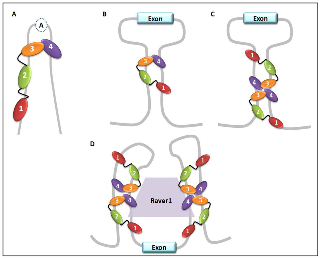 Models of RNA-PTB interaction in exon splicing repression. (A) Repression by PTB looping out a branch-point adenosine; (B) PTB monomer looping-out an exon; (C) Multiple PTB molecules binding cooperatively around an alternative exon; (D) PTB cooperates with the co-factor Raver1 to loop out an alternative exon by binding to distant intronic pyrimidine tracts.