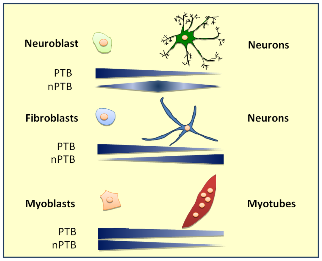 A relevant role played by PTB in splicing regulation during cell differentiation is highlighted by studies on neuronal differentiation, reviewed in [18]. PTB and its homolog nPTB are subject to a programmed switch during neuronal development [89,162]. In post-mitotic neurons a reduced expression of PTB coincides with an increased expression of nPTB, which modifies the neuronal alternative splicing program [47,52,90,163]. A similar switch in the expression of PTB versus nPTB seems to occur in post-mitotic lens fibre cells [164]. A recent study described by Zheng et al. [86] in a mouse model reveals new clues for the understanding of the PTB role during neuronal development. The authors describe three defined phases during neuronal differentiation in which different levels of PTB and nPTB expression mediate splicing regulation. These three phases are characterized by the expression of PTB regulated alternative splice isoforms of the postsynaptic density protein 95 (PSD-95). PSD-95 is an essential factor required for synaptic maturation and plasticity. Both PTB and nPTB repress PSD-95 exon 18 inclusion, leading to premature translation termination and subsequent NMD of the spliced isoform. The reduced expression of PSD-95 protein prevents a precocious stabilization of early generated synapses. The results show that during the initial phase occurring in neuronal stem cells, PTB expression is associated with low levels of PSD-95. The transition to the second phase, represented by the start of neuronal differentiation, comes along with the sequential shift to an increased expression of nPTB and downregulation of PTB, but maintaining a sufficient amount of the two proteins to repress the PSD-95 protein expression. Finally, in the third phase, after mouse birth in cells undergoing synaptic maturation, both PTB and nPTB expression is reduced, causing the stability of the PSD-95 splicing isoforms and consequently an increase of the protein levels and the start of synaptic maturation. Further proof of the functional role of the switch in PTB/nPTB expression in controlling alternative splicing programs required during neuronal development is given by recent results showing the conversion of PTB-depleted fibroblast into neuronal-like cells [165]. A comprehensive view of the regulated expression of PTB and nPTB during cell differentiation is presented in Figure 4.