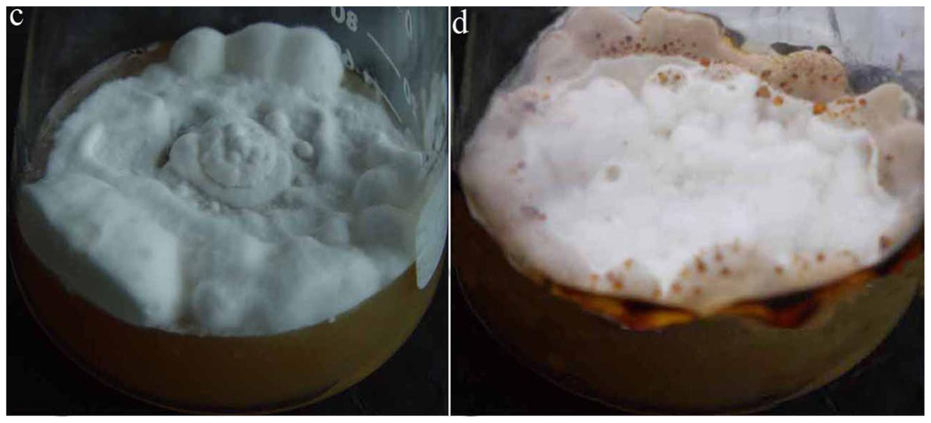The fructose complete medium was composed of fructose 20.0 g L−1, peptone 4.0 g L−1, MgSO4·7H2O 0.5 g L−1, KH2PO4 0.5 g L−1, K2HPO4 1.0 g L−1, vitamin B1 0.05 mg L−1 and agar 10.0 g L−1. The initial pH value was adjusted to 7.0 before the agar was added, and then the medium except for vitamin B1 was autoclaved. Vitamin B1 was sterilized by filtration through a 0.22 μm Millipore filter and then added evenly to the autoclaved medium [3]. The medium was poured into the conical flask. Mycelial plugs of 8 mm in diameter obtained from the actively-growing colonies in the petri dishes were transferred to the center of each conical flask containing 20 mL of solid agar medium at 25 °C under dark conditions.
