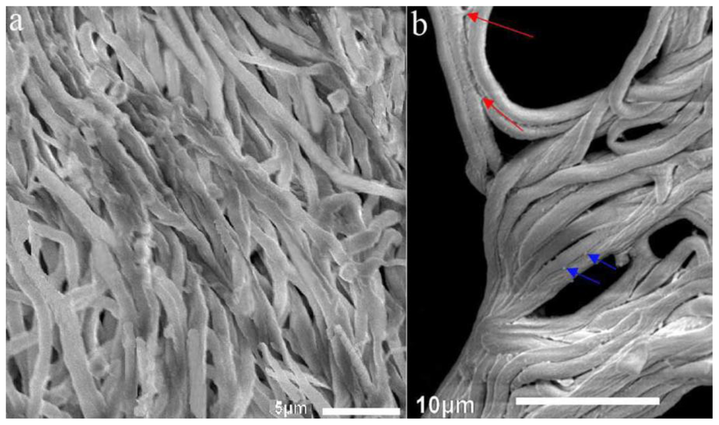 Scanning electron microscopy (SEM) examination of artificial sclerotia at 8 °C and mycelia at 25 °C after 120 days of cultivation. (a) depicts loosened mycelia cultured at 25 °C without sclerotial development; (b) depicts the condensed and fused mycelia in the SM stage of sclerotial formation cultivated at 8 °C. Images are representatives of three independent experiments. Scale bar, (a) 5 μm; (b) 10 μm.
