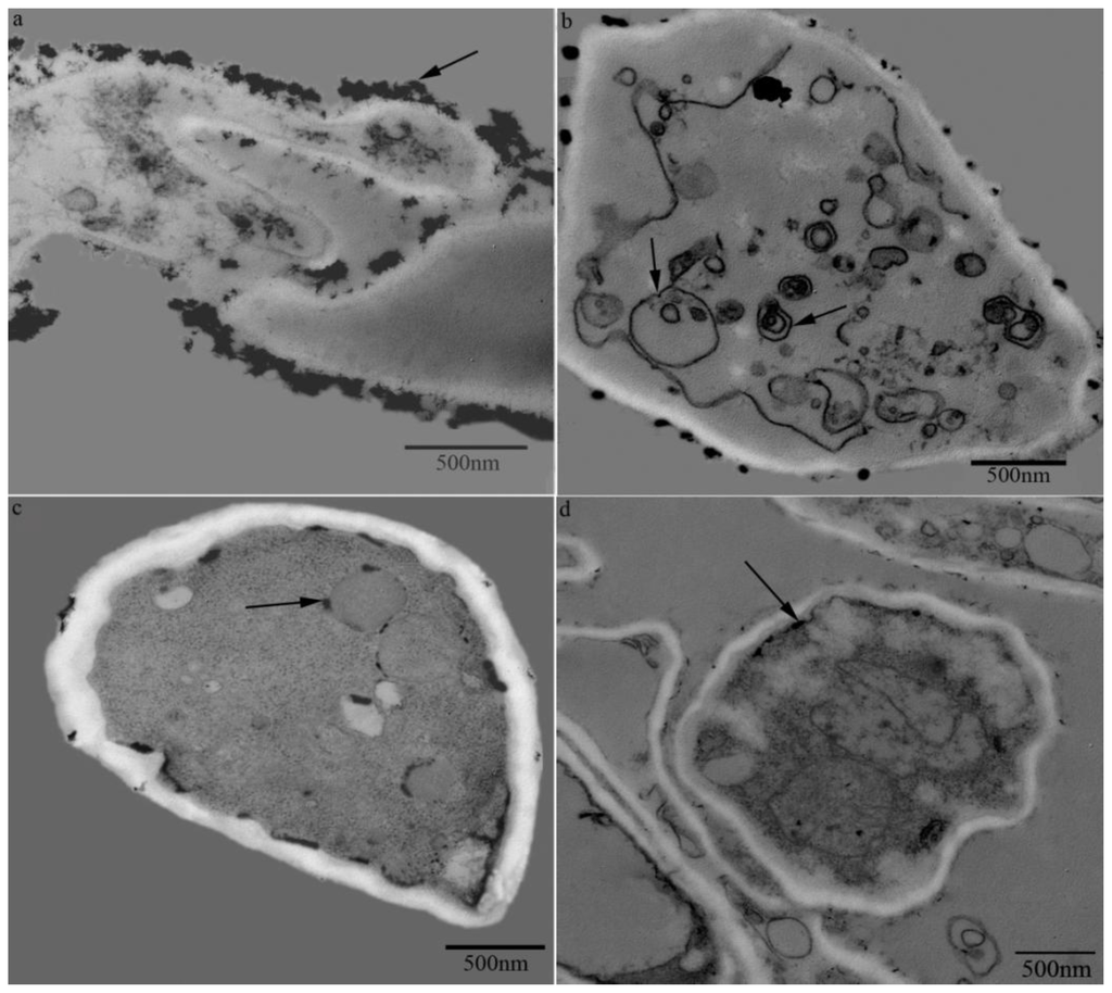 Cytochemical localization of H2O2 using transmission electron microscopy (TEM). (a) CeCl3 (i.e., H2O2 production) is deposited around the cell walls (black arrow) in the SD stage of sclerotial formation; (b) H2O2 production is shown in the cell walls and around the organelles such as the tonoplasts and endoplasmic reticulum membranes (black arrows) during the SM stage of sclerotial formation; (c) Low concentrations of H2O2 are observed in the cell walls, tonoplasts and plasma membranes in the control group without sclerotial formation; (d) Low concentrations of H2O2 are observed in the cell walls and plasma membranes in the DPI treatment group. Pictures are representative of three independent experiments. Scale bar, 500nm.
