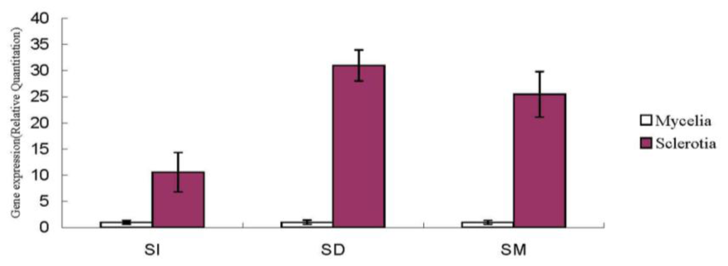A 2010-bp full-length cDNA of NADPH oxidase gene named PUNOX (Genebank accession number: Jk035912) contained 1674-bp ORF, and it was predicted to encode a 557 amino acid protein of 63,845 kDa, with an isoeletronic point (PI) of 5.58 [16]. In the SI stage of sclerotial formation, the Nox gene expression in sclerotia was 10.577 times that of the mycelia. In the SD stage, the Nox gene expression reached the maximum, which was 30.984 times that of the mycelia. In terms of the SM stage, the Nox gene was expressed 25.469 times that of the mycelia (Figure 5).