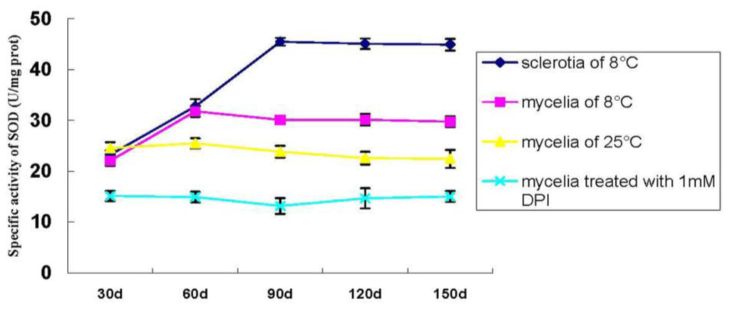 The specific activity of SOD in P. umbellatus mycelia cultivated at 25 °C throughout the time was stable and relatively low. The SOD level in mycelia was not high when cultured at 25 °C, but it was higher when exposed at 8 °C for a time of 60 days (SI) and retained this high level after that. The activity of SOD increased at a cultivation time of 90 days (SD) and remained stable at 120 days (SM) (Figure 6). After being treated with DPI (1 mmol L−1), sclerotia did not appear even in the temperature shift treatment and the SOD level was even lower than that of the mycelia cultivated at 25 °C throughout the cultivation (Figure 6).