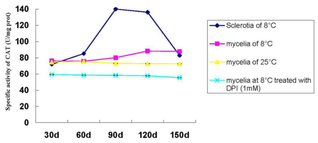 The CAT activity of the mycelia in P. umbellatus was low after 30 days of cultivation at 25 °C and the CAT activity of the sclerotia rose to a high level when the fungus was exposed to temperature shift treatment. Afterwards, it reached its highest level during the SD stage. However, it gradually decreased at the SM stage and dropped sharply after that (150 days). Moreover, it was found that the CAT activity was even lower than that of the mycelia cultivated at the same low temperature conditions. The CAT activity of the mycelia in P. umbellatus remained constant at 25 °C throughout the time (Figure 7). After being treated with the antioxidant DPI (1 mmol L−1), the CAT activity performed in a similar manner to the SOD activity during the P. umbellatus sclerotial formation (Figure 7).
