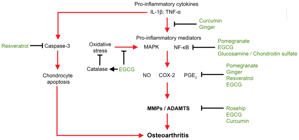 Pomegranate extracts exert anti-inflammatory actions by inhibiting the activity of NF-κB, COX-2 and PGE2[94,138]. Prodelphinidin—a condensed polymeric tannin that can be found in pomegranate—inhibited PGE2 synthesis by down-regulating COX-2 in human chondrocytes [139]. Ginger extract has been demonstrated to decrease the IL-1β and LPS-induced production of NO and PGE2 in OA cartilage [140]. Furthermore, ginger extract was effective in inhibiting the production of TNF-α, PGE2, and COX-2 expression in human synoviocytes by regulating NF-κB activation and degradation of its inhibitor IkB-α [141]. It has also been reported to decrease the IL-1β-induced expression of TNF-α and TNF-α-induced production of COX-2 in synoviocytes [142]. Resveratrol is a polyphenolic phytoalexin present in grapes, berries, and peanuts. Resveratrol suppresses NF-κB-dependent pro-inflammatory products, including PGE2 and COX-2 [143,144]. Resveratrol has also been shown to inhibit IL-1β-induced apoptosis by inhibiting caspase-3 and downregulating the NF-κB pathway in chondrocytes [145]. Epigallocatechin 3-gallate (EGCG), a bioactive polyphenol found in green tea, inhibits the production of inflammatory mediators including PGE2, COX-2, and NF-κB [146]. By inhibiting the NF-κB pathway, EGCG suppressed IL6, IL-8, and TNF-α in IL-1β stimulated human OA chondrocytes [147]. Curcumin inhibited IL-1β-induced NF-κB activation and translocation, resulting in reduced expression of NF-κB downstream pro-inflammatory gene COX-2 [90]. Curcumin also prevented production of NO, PGE2, IL-6, and IL-8 stimulated by IL-1β [96]. Rosehip preparations have anti-inflammatory properties, and have been shown to inhibit expression of iNOS and IL-1α, and IL-1β-induced IL-1α and IL-8 in chondrocytes. The combination of glucosamine and chondroitin sulfate suppressed gene expression of COX-2 and NF-κB induced by IL-1 in cartilage explants, leading to reduced production of NO and PGE2[148]. One of the mechanisms through which glucosamine or chondroitin sulfate exerts anti-inflammation is by inhibiting the IL-1β induced NF-κB pathway, resulting in a reduction in the COX-2 synthesis [149].