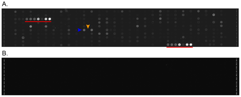 Explicative scan portion of miRNA microarray after the RAKE and labeling reactions (A) and before hybridization (B). Spike-in spots are indicated by red lines; the blue arrow indicates a specific probe, and the orange arrow indicates its background probe. Each background probe was positioned to the right of its probe.