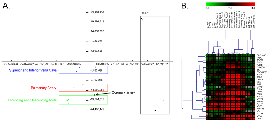 (A) Principal component analysis (PCA). The first three components account for 62.8% of the observed variance. The green rectangle identifies the group of ascending and descending aorta samples (green dots); the coronary artery is indicated by a black dot, the red rectangle highlights pulmonary artery samples (red dots), and the blue rectangle surrounds superior and inferior vena cava samples (blue dots). On the right, separated from other samples, are heart samples; (B) Heat map of muscle transcripts. Transcripts coding for muscle proteins are up-regulated in arteries with respect to veins. The red squares indicate up-regulated genes, and the green squares indicate down-regulated genes. The grey squares indicate genes for which no expression was detected. L.P.V. = leaflet of pulmonary valve; Inf. Vena Cava = inferior vena cava; Sup. Vena Cava = superior vena cava. The numbers following the sample names indicate the number of experimental replicates.