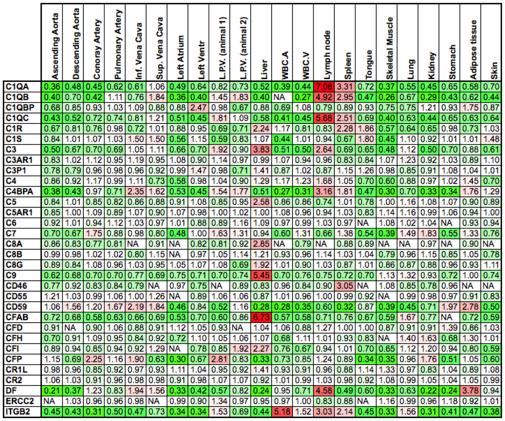 Expression of genes involved in the complement response. The numbers represent gene expression levels normalized to the average expression of the same gene across all tissues. Down-regulated genes are shown in green, and up-regulated genes are shown in red. Most of the up-regulated genes are expressed in the liver, which is responsible for the synthesis of most of the proteins of the complement system, in the spleen and in lymph nodes (lymphoid organs). NA = Expression not detected; L.P.V. = leaflet pulmonary valve; WBC.A = white blood cells from arterial blood; WBC.V = white blood cells from venous blood.