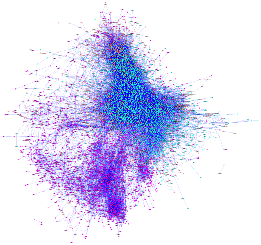 Pathway analysis fails to consider many known genes and miRNAs that are not annotated in any pathway. To fill these gaps, we used de novo network reconstruction using both mRNA and miRNA profiles. Using a correlation measure with a permutation-based threshold of 0.9 of mutual information (0.9 was the maximum value of mutual information of the network generated by the permuted expression matrix), we generated a network with 7762 nodes (7647 genes and 115 miRNAs) and 44,092 edges (Figure 4). The global architecture of the network is characterized by two large clusters, which are shown as the blue and violet nodes in Figure 4. As expected (Figure 2A), these two clusters are composed of genes prevalently expressed in heart (the most different tissue) and in blood vessels (Figure S1). Thus, we separated these two clusters to create a vessel-specific and a heart-specific network.