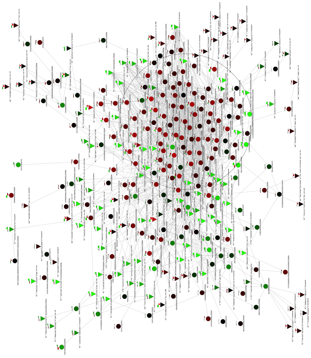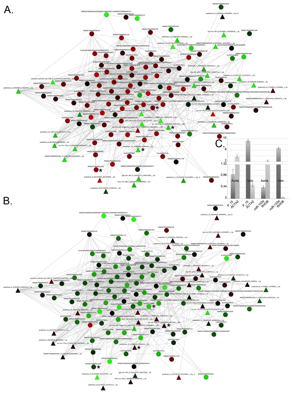 Enlarged view of the densely connected area of Figure 5. (A) The colors indicate expression in the aorta; (B) The colors indicate expression in veins. The triangles represent miRNAs; circles represent mRNAs. Up-regulated = red; down-regulated = green; * = nodes discussed in the text; (C) qRT-PCR results confirm that there is an inverse relationship between miRNAs and their targets. P_15 is for prediction_15_14390446_14390503_-_3p. In Y axis the original expression level related to H3. Bars are for standard deviation between three replicates.