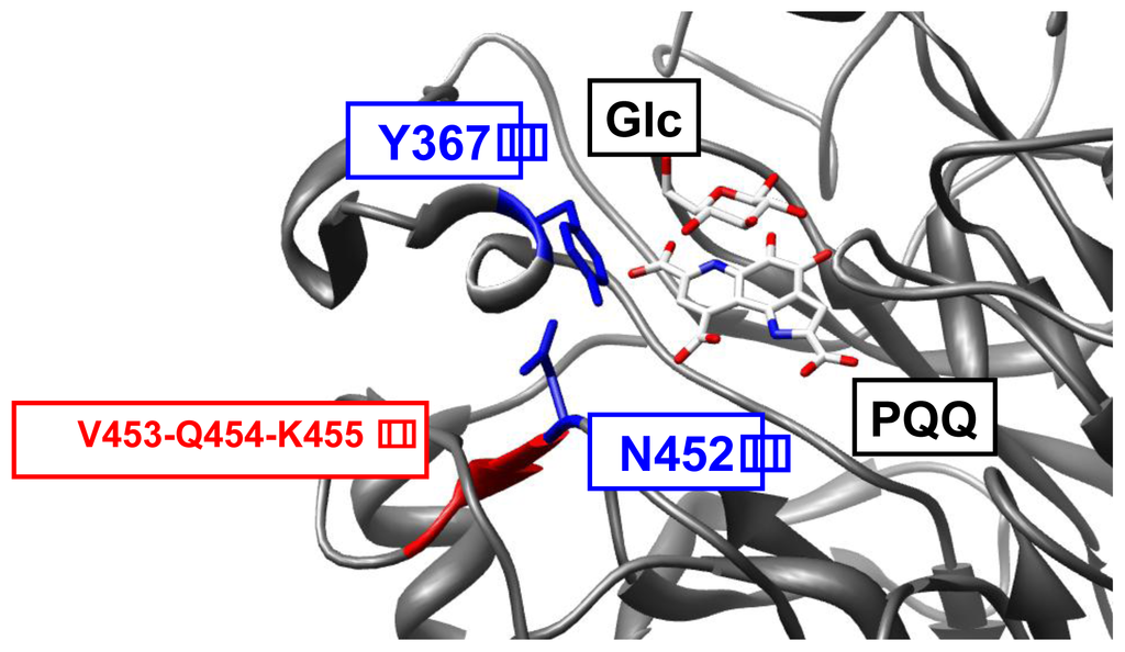 - Oubrie, A.; Rozeboom, H.J.; Kalk, K.H.; Olsthoorn, A.J.; Duine, J.A.; Dijkstra, B.W. Structure and mechanism of soluble quinoprotein glucose dehydrogenase. EMBO J 1999, 18, 5187–5194. [Google Scholar]