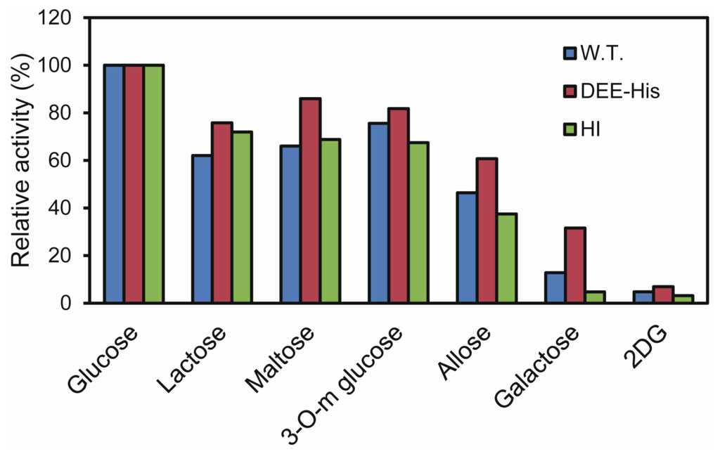 - Hamamatsu, N.; Suzumura, A.; Nomiya, Y.; Sato, M.; Aita, T.; Nakajima, M.; Husimi, Y.; Shibanaka, Y. Modified substrate specificity of pyrroloquinoline quinone glucose dehydrogenase by biased mutation assembling with optimized amino acid substitution. Appl. Microbiol. Biotechnol 2006, 73, 607–617. [Google Scholar]