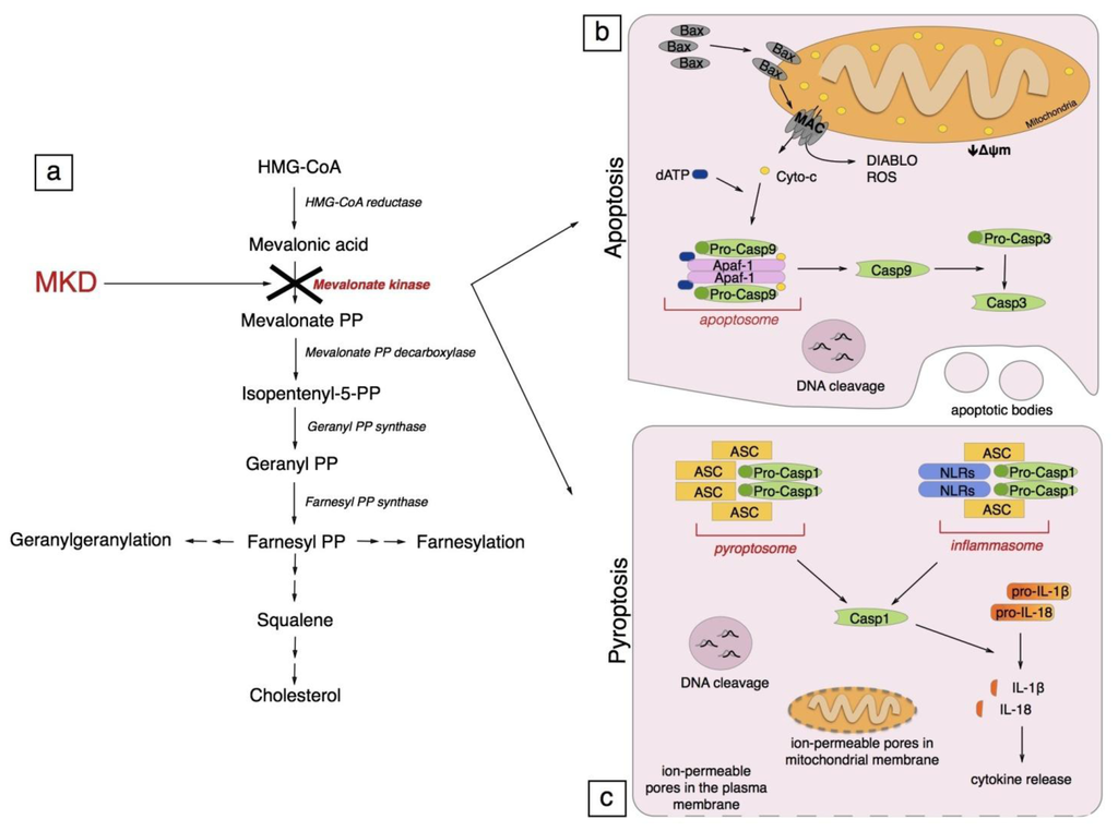 MKD models, in vitro and in vivo, showed that the typical programmed cell death occurring in Mevalonate Kinase Deficiency is linked both to the intrinsic apoptosis pathway and to pyroptosis [,].