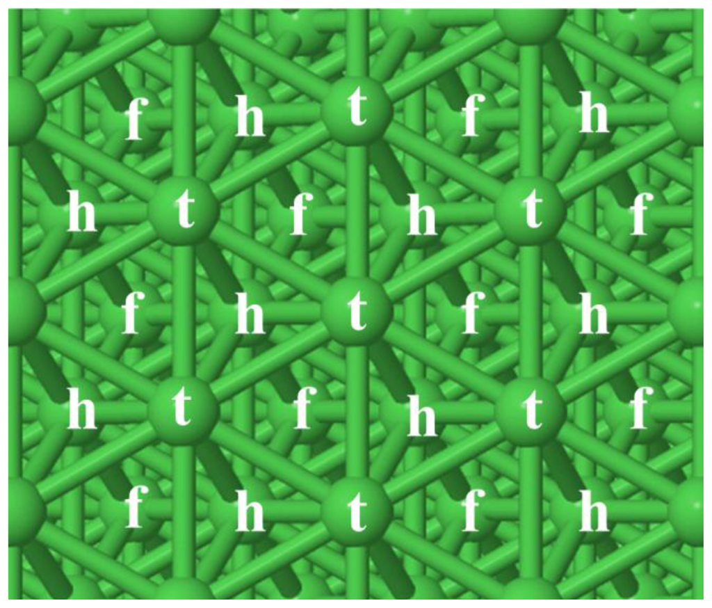 Top (t), hollow hcp (h) and hollow fcc (f) sites on the Ni(111).