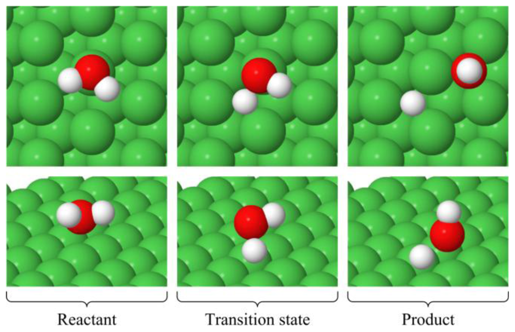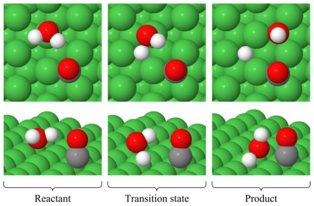 Minimum energy structures of the reactant, transition state and product for the H2O* → OH* + H* reaction.