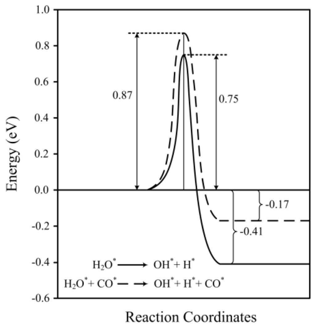 Reaction profiles for the water dissociation with (dashed line) and without (solid line) co-adsorbed CO.