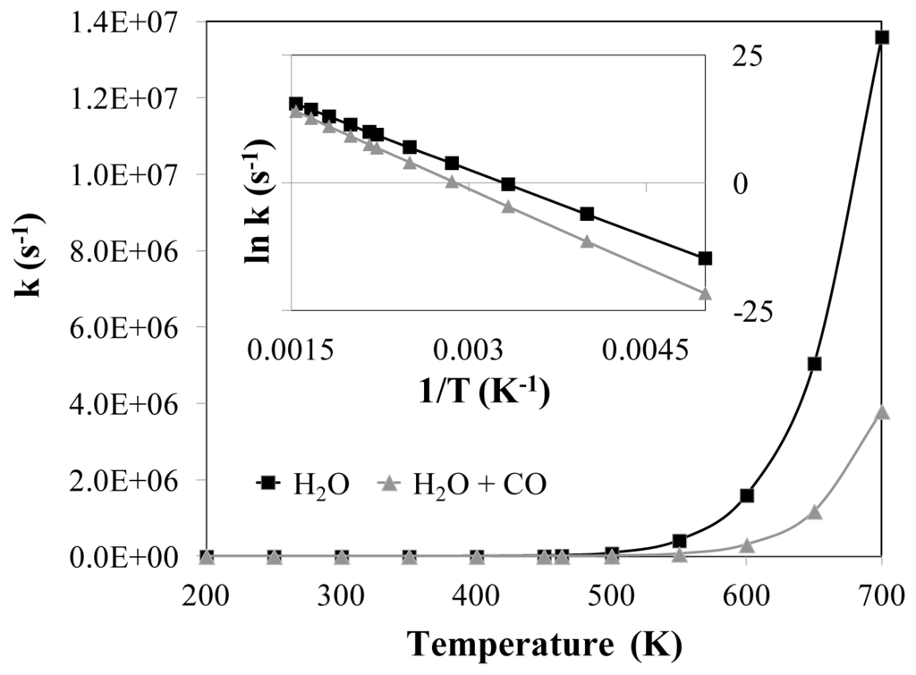 Figure 5 shows the effect of temperature on the reaction rate constant. The data is also shown in its Arrhenius form in the inset to the figure. The difference in reaction rate constants in the absence and presence of CO increases with increasing temperature, showing that it becomes even more important to consider the effect of CO co-adsorption at higher temperatures.