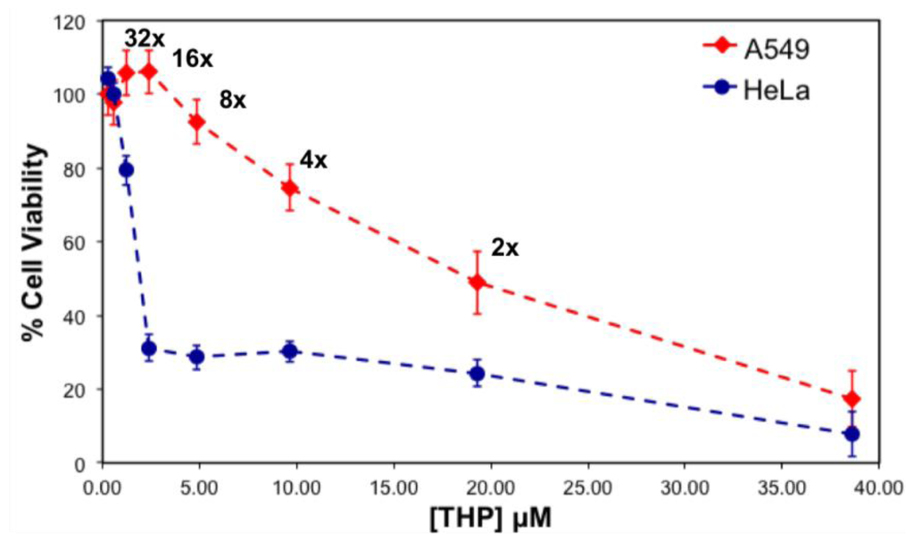Au et al. emphasized the importance of drug stability upon dilution during treatment time in clinical trials []. Since, the peptide-drug complex at a 5:1 ratio illustrated appropriate properties such as size, charge and toxicity against cancer cells, cytotoxicity testing was performed for this particular complex, and its serial dilution solutions were tested against two human cancer cell lines, including the non-small lung cancer cell A549, cervical adenocarcinoma HeLa. Figure 10 represents the viability of the cells treated with the 5:1 ratio complex and its serial dilution in water, where the final concentration of THP is between 0.3 and 38 μM. The IC50 values of the complex for the cancer cells were calculated, and followed the following trend; THP concentration at ~19.3 μM for A549 >~1.8 μM for HeLa cells [].